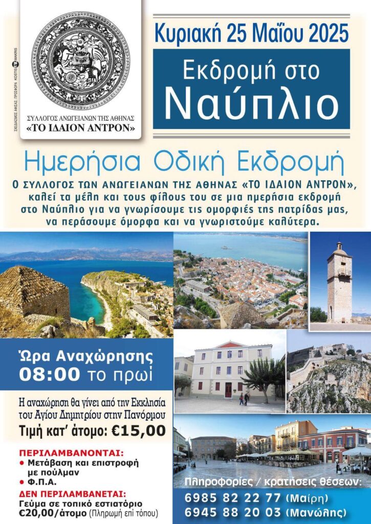 Την Κυριακή 25 Μαΐου 2025, ο σύλλογός μας, μαζί με όλα τα μέλη του, πραγματοποίησε μια μονοήμερη εκδρομή στο όμορφο Ναύπλιο. Η ημέρα ήταν γεμάτη χαρά, τραγούδι, χορό και στιγμές που θα μείνουν αξέχαστες σε όλους μας.