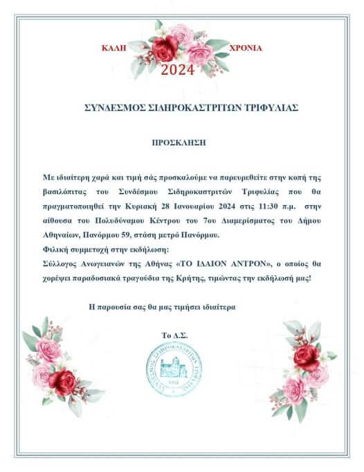 Το πρωί της Κυριακής 28 Ιανουαρίου 2024, η χορευτική ομάδα του συλλόγου μας συμμετείχε με χαρά στην εκδήλωση για την κοπή της πρωτοχρονιάτικης πίτας του Συνδέσμου Σιδηροκαστριτών Τριφυλίας.Στη μουσική μας συνοδεία ήταν ο Παναγιώτης Καραγιωργάκης με την παρέα του, προσφέροντας ζωντανή και όμορφη ατμόσφαιρα. Ευχαριστούμε θερμά τον Σύνδεσμο Σιδηροκαστριτών Τριφυλίας για την τιμητική πρόσκληση.